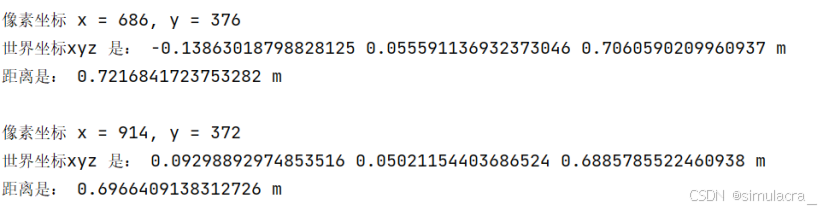 print("世界坐标xyz 是:", threed[y][x][0] / 1000.0, threed[y][x][1] / 1000.0, threed[y][x][2] / 1000.0, "m")