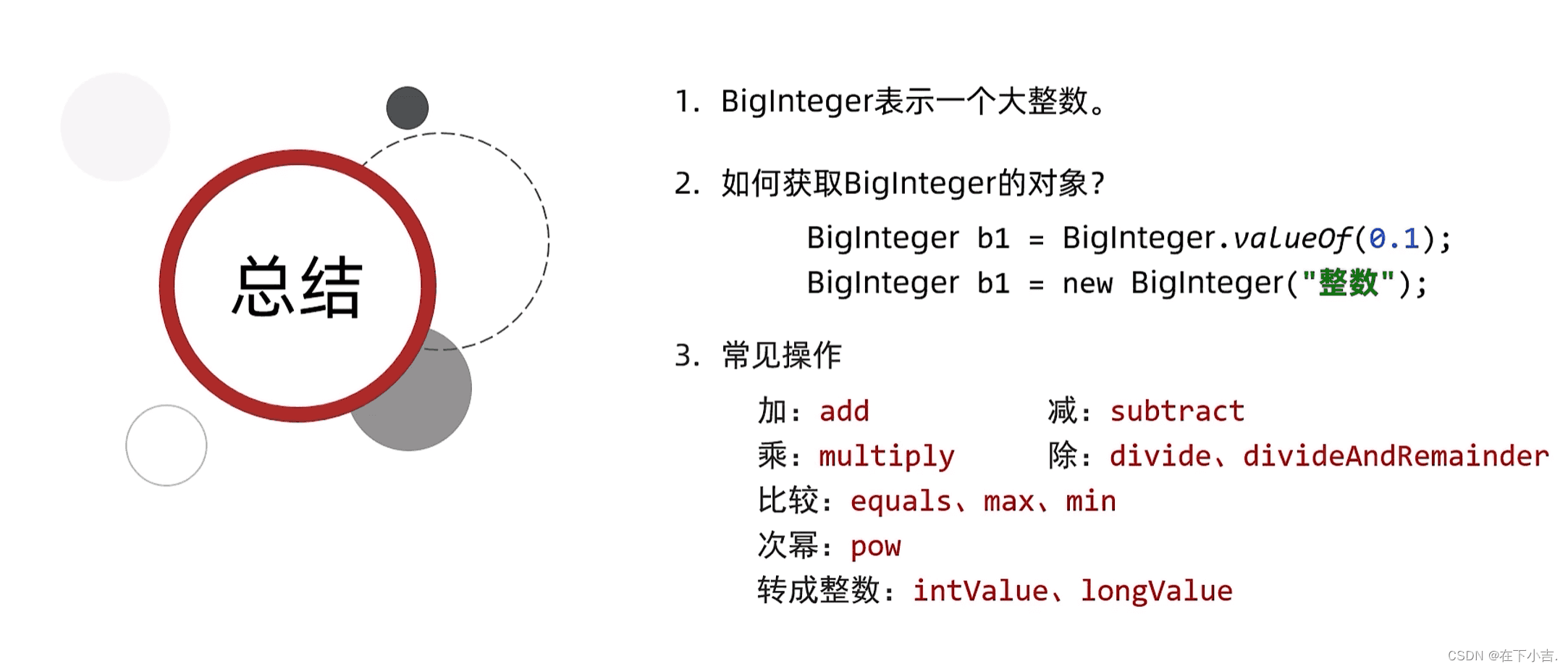 biginteger 类提供了许多方法来进行整数的运算,包括加法、减法、乘法、除法、取余等。它还支持比较、位操作、幂运算等功能。