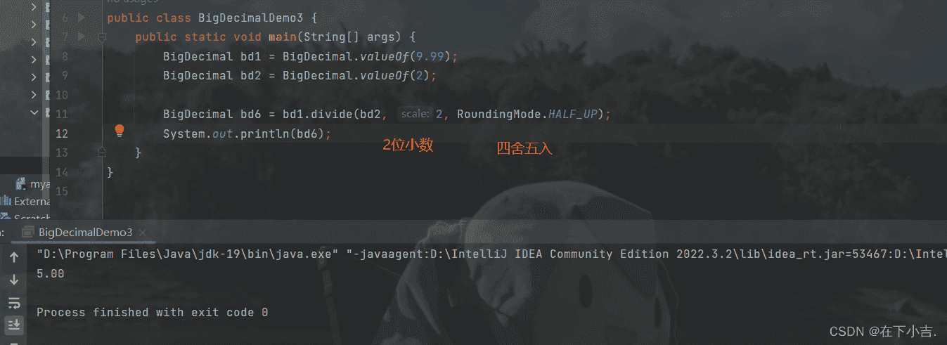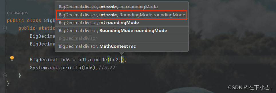 public bigdecimal divide(bigdecimal val,精确几位,舍入模式);