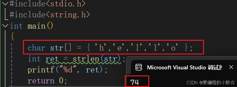 为什么这里计算str字符数组的长度是74呢?因为这里的初始化方式是不会自动补上 \0,所以strlen函数会根据地址一直往后找,直到找到 \0,所以这里的 74 实际上是一个随机值。