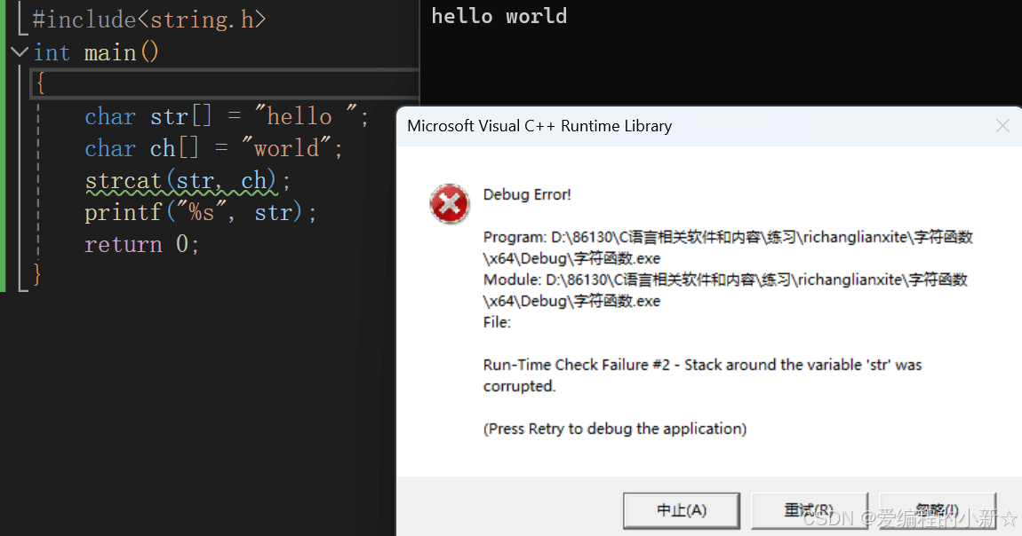 那么strcat函数是否可以自己追加自己呢?其实是可以的,但是一般不会这样使用,使用不当很容易造成死循环的问题 ,对于自己追加自己,我们一般使用strncat函数,在下面我们将会了解到strncat函数。