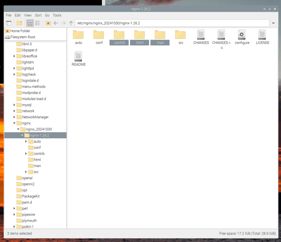 //创建一个路径在/etc/nginx/nginx_20241030 sudo mkdir -p /etc/nginx/nginx_20241030 //拷贝解压文件到上面创建的路径 sudo cp -r nginx-1.26.2 /etc/nginx/nginx_20241030/ //看看文件在不在 ls /etc/nginx/nginx_20241030/
