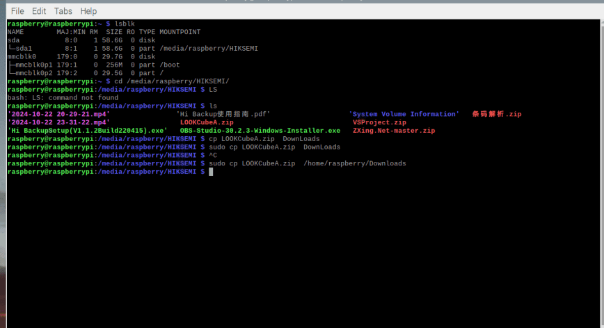 //找到u盘 raspberry@raspberrypi:~ $ lsblk name maj:min rm size ro type mountpoint sda 8:0 1 58.6g 0 disk └─sda1 8:1 1 58.6g 0 part /media/raspberry/hiksemi mmcblk0 179:0 0 29.7g 0 disk ├─mmcblk0p1 179:1 0 256m 0 part /boot └─mmcblk0p2 179:2 0 29.5g 0 part / //查看u盘文件 cd /media/raspberry/hiksemi/ ls //复制文件到downloads sudo cp lookcubea.zip /home/raspberry/downloads //解压文件 确认已经安装了unzip unzip -v 安装会输出版本号,记得先运行 cd ~ 切换到home 么有安装就安装 sudo apt-get update sudo apt-get install unzip 解压 cd /home/pi/downloads/ unzip lookcubea.zip //将文件复制到nginx下 切换到文件夹内部 cd lookcubea/ 编译nginx ,么有报错就是编译好了 sudo ./configure 复制文件 sudo cp -r * /etc/nginx/nginx_20241030/nginx-1.26.2/html 切换到复制的文件夹 cd /etc/nginx/nginx_20241030/nginx-1.26.2/html 查看文件 ls 50x.html build/ index.html templatedata/ 删除文件(如果有必要) sudo rm -rf lookcubea/