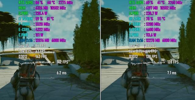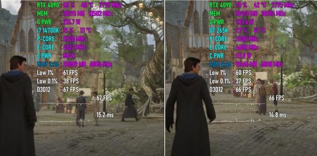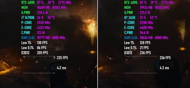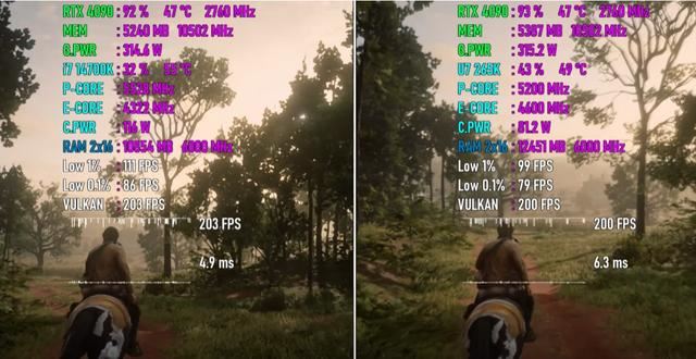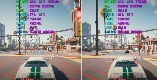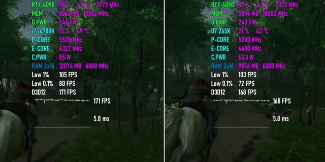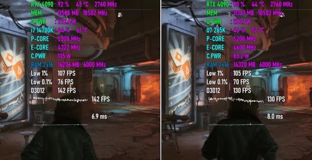 以下将分别测试七款游戏,均采用1080p画质模式,以下系列图片中左边代表core i7-14700k平台,右边代表core ultra 7 265k平台。
