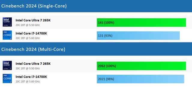 不过,core ultra 7 265k的单核性能和多核性能比core i7-14700k还是略强,单核性能约高7%,多核性能约高2%,性能在非游戏应用场景中可能有一些优势。