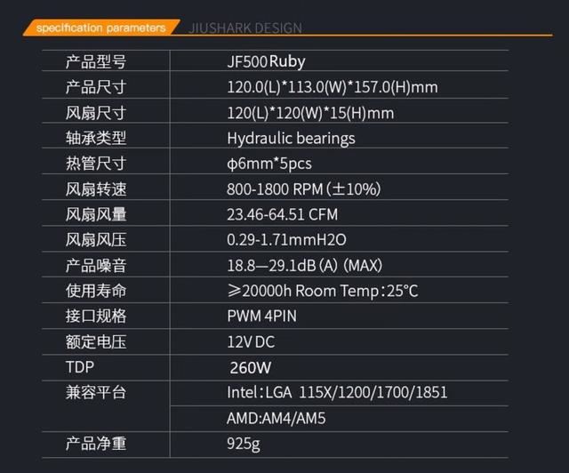 简单列一下九鲨jf500ruby这款风扇的参数: