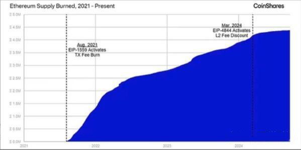 但随着 2024 年“blob space”的引入,l2 现在可以以低得多的成本在 l1 上结算交易,从而减少了支付昂贵的 l1 费用的要求。随着越来越多的活动迁移到 l2,eip-1559 旨在灌输的供应量消耗开始下降,削弱了 eth 供应量的下行压力。