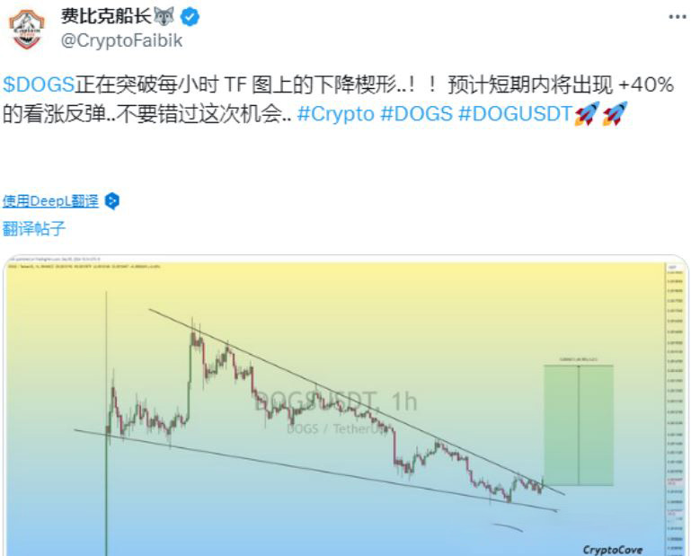 capital faibik (@cryptofaibik) 发推文称,dogs 加密货币价格已达到关键突破水平。价格在每小时时间范围内形成了下降楔形模式,正在等待突破。