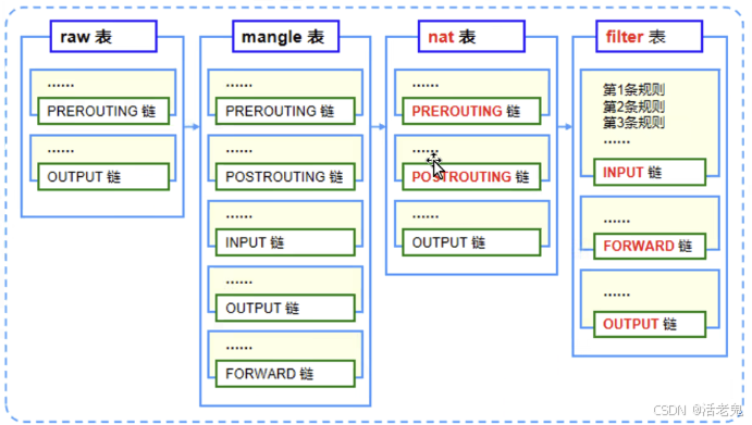 - nat表:负责网络地址转换,用来的修改数据包中的源、目标ip地址或端口。包含三个规则链 - output、prerouting、postrouting。