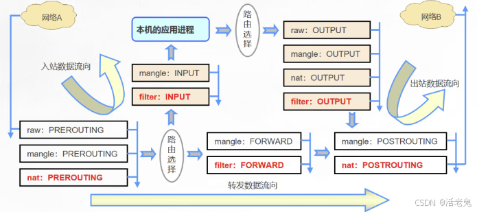 - 出站数据:本机的应用程序 -> output -> postrouting