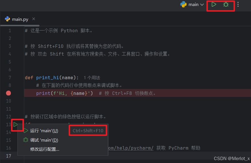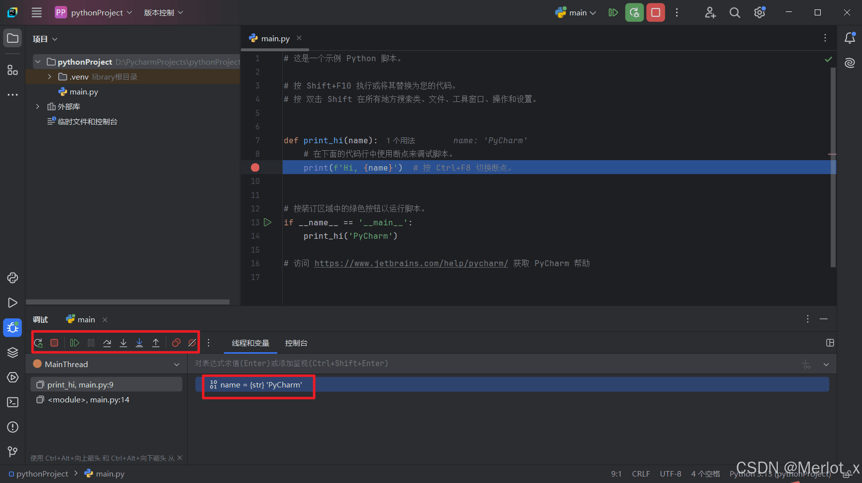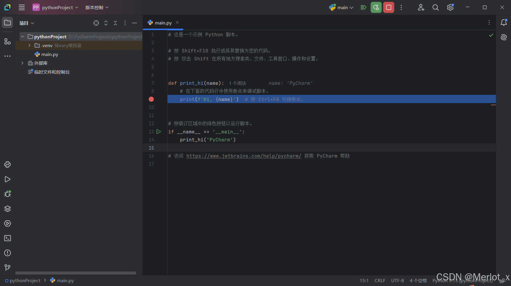 name = {str}'pycharm'此处可以从调试界面得知,调用 print_hi 函数传递过来的值是字符串类型的pycharm
