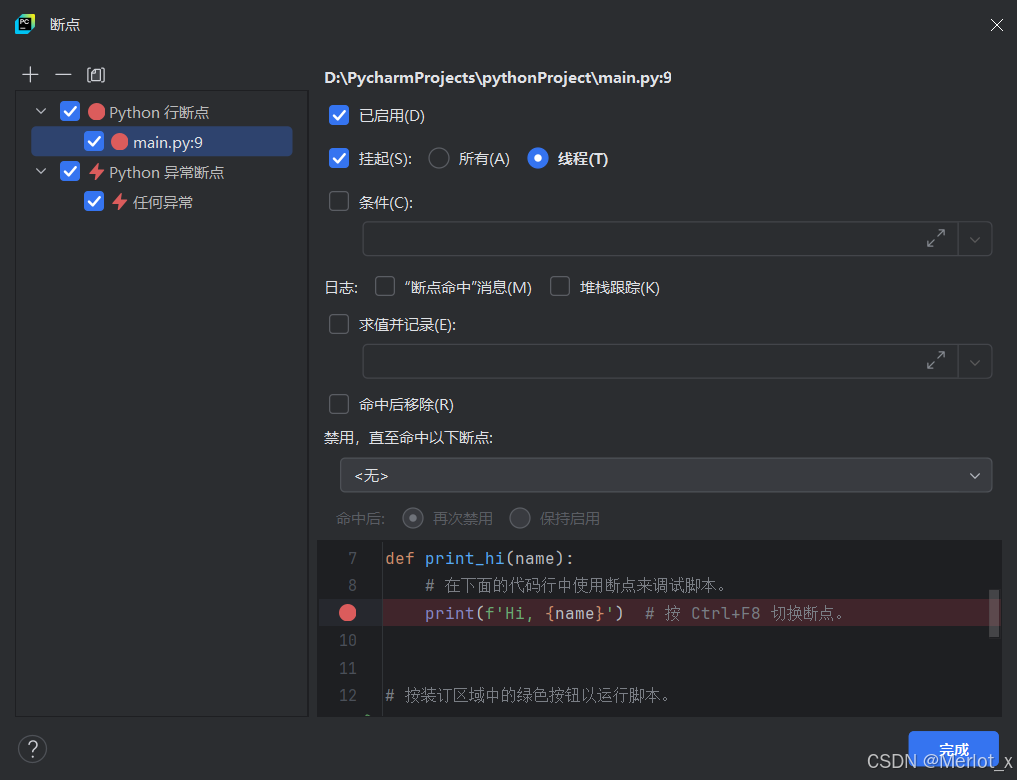 - 可以查看到当前程序所有的断点。断点分为两种:一种是行断点,是自己设置的、以供调试使用的断点;另一种是异常断点,即报错,运行到那就会停了