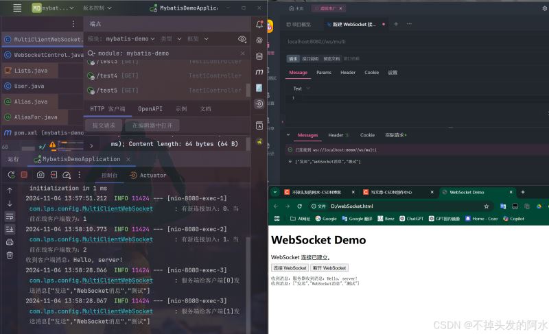 启动 spring boot 项目后,websocket 服务端地址为:ws://localhost:8080/ws/multi。可以使用 websocket 测试工具(例如 apifox或浏览器控制台)测试 websocket 通信。