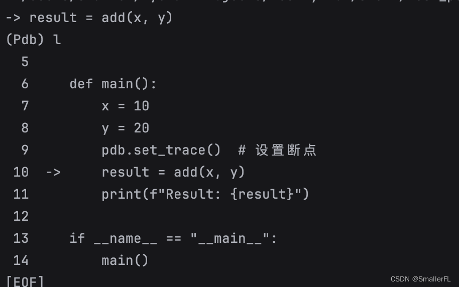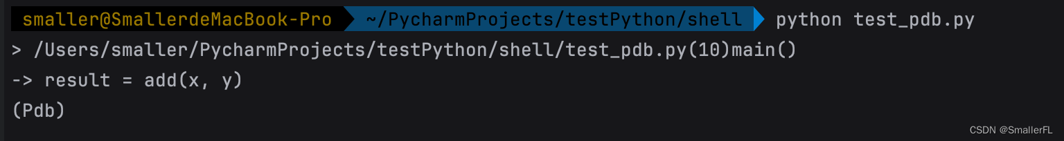 运行程序后,程序会在pdb.set_trace()处暂停,进入交互式调试模式。