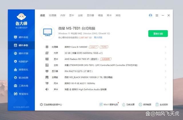 来看看电脑的配置,cpu是英特尔i9-14900kf,内存是宏碁ddr5 6400mhz,显卡是蓝宝石rx 7900xt,主板是微星z790mpower,硬盘是西数wd_black sn850x。