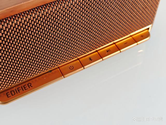 音箱正面的网罩采用了同样色调的编织网布,保护着内部的发声单元,同时网罩的设计也十分简洁,左上角镶嵌着漫步者的品牌标识,低调而不失格调。在最下方,则是一排犹如钢琴琴键样式的按键,整体造型像个传统的复古收音机。