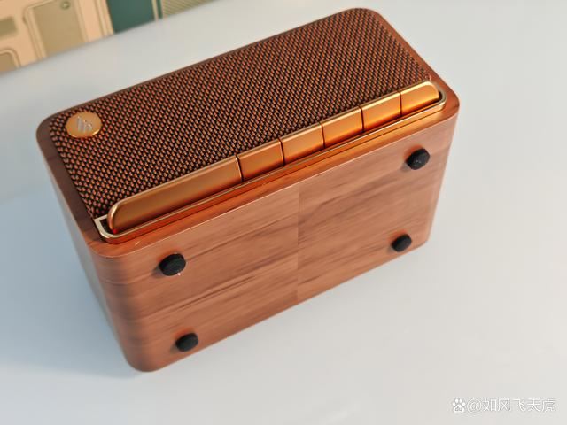 这些按键采用了鎏金的配色再加上哑光电镀处理,看起来金光闪闪又十分有质感。当然按键的功能不是传统的收音机,而是蓝牙音箱的配备。最左侧的是电源按键,然后是蓝牙按键,播放/暂停键,音量“-”和“+”按键,功能一目了然,操作上手也十分简单。