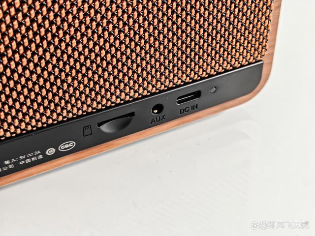接下来咱们看一下这款音箱的多种输入方式,第一个是tf卡,现在的标准称谓是microsd卡,家里长辈喜欢跳舞的插上卡就能带出门了,非常实用。另外还有aux输入,dc in输入接口是usb-c接口,在家连接电脑等设备都很方便。