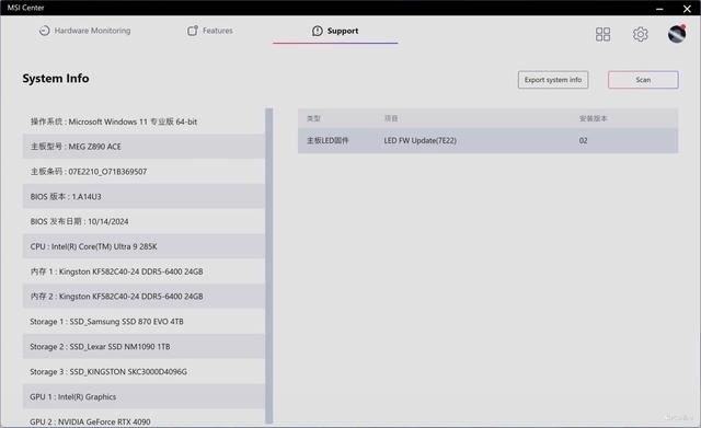 测评平台方面,我们这里直接使用了微星提供的meg ace媒体送测版本,显卡则是nvidia rtx 4090显卡。
