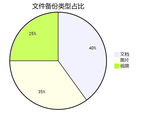 下面是一个饼状图示例,展示备份文件的类型分布。假设我们有三种类型的文件:文档、图片和视频。
