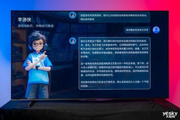 海信e7n首发了十二大ai智能体,在电视端引入了gpt级别的ai交互体验。与传统大模型的ai通用智能不同,海信也结合不同场景,将ai赋能的能力分为了包含影视、游戏、健身、育儿等诸多不同身份的智能体。你可以与更垂直门类的ai助手进行对话,比如我们给游戏智能体提个问题——“如何击败王灵官?”,他就能做出十分细节的回答。
