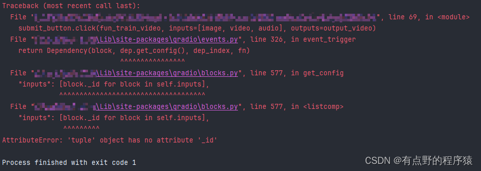 当gradio尝试获取输入组件id的时候,会从元组中获取_id属性,但是元组中没有这个属性,就会抛出异常。