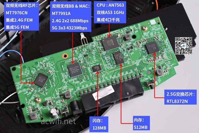 然后视线移一步,看旁边的mt7991a,它是一颗双频无线mac和无线基带芯片,6nm制程。2.4g支持2x2mimo,最大速率;5g支持3x3mimo,最大速率为4323mbps。ofdma用户数量方面,2.4g最多8个,5g最多16个。