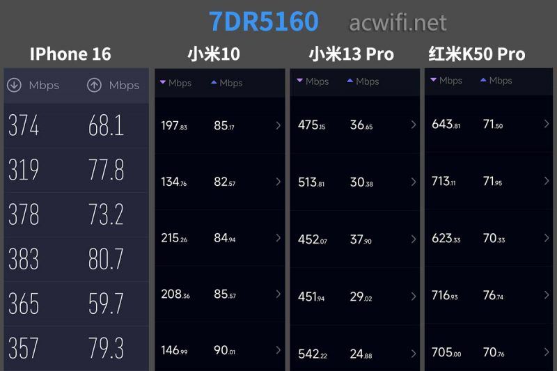 咦好鬼少有iphone 16手机会比小米10手机快的,有点反常。后面三台手机测速,是没有7dr7230 、7260这样快的,毕竟3x3mimo和4x4mimo的差异。