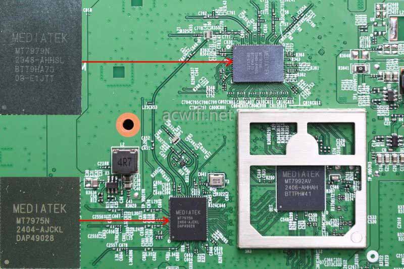 然后mt7922a连接着mt7975n和mt7979n,前者是2.4g射频芯片,支持4t4r,后者是5g射频芯片,支持4t5r。这两颗无线射频芯片都集成了功放。
