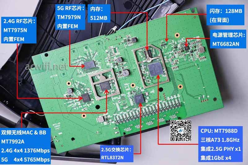 mt7992a的双频均支持4x4mimo,无线速率分别为1376mbps+5765mbps。