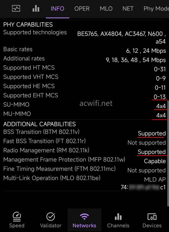 用analiti app查看无线属性,默认支持4096-qam、波束成形、mu-mimo、802.11v、802.11k: