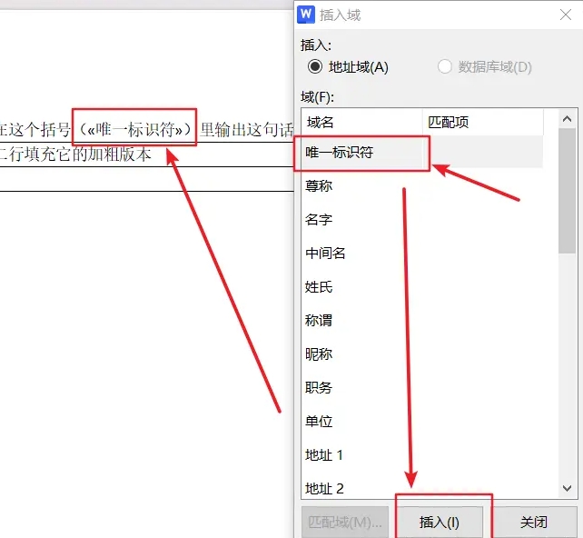在 “插入域” 弹窗的选项中选择域名为 “唯一标识符” 的选项插入,先前鼠标定位的位置就会添加上这个小书名号包裹的 “唯一标识符”。