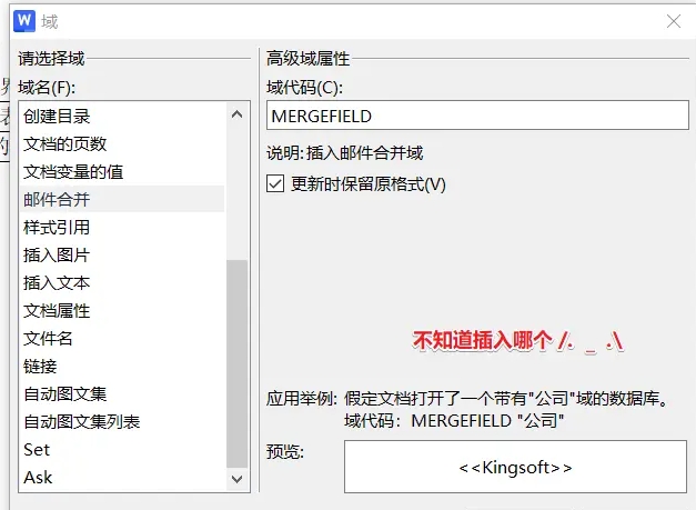 不过这个邮件合并域功能目前我只在 wps 的 “引用” 模块里有找到,在 office 的 word 里没有找到对应的地方。虽然 “插入” 里可以选择 “域”,但操作起来容易出错,我自己就没看懂应该选哪个去插入……