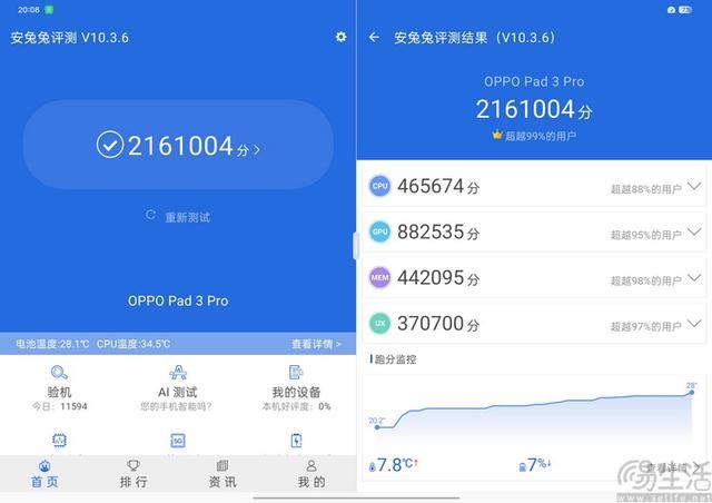 最终,我们手头这台16gb+512gb版本的oppo pad3 pro,在安兔兔评测中跑出了2161004分的综合成绩。这比前代的oppo pad 2提升了100%以上,放在如今的安卓旗舰平板市场里也绝对是最高的那一档。