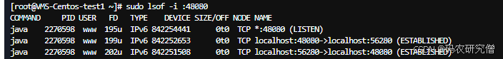 查询特定端口(例如 48080)被哪个进程占用:sudo lsof -i :48080