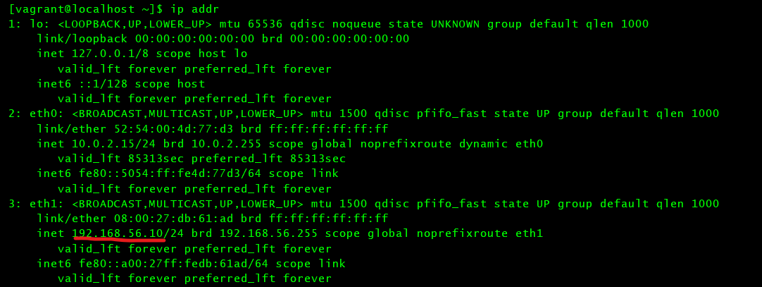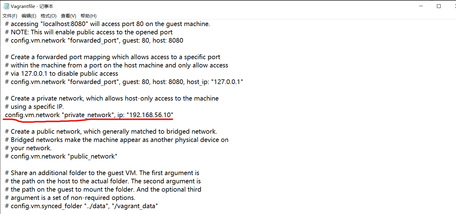修改vagrantfile文件,配置虚拟机ip地址,修改虚拟机ip地址为同一网段下,如192.168.56.10