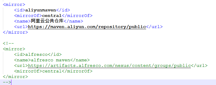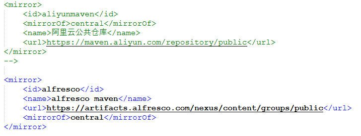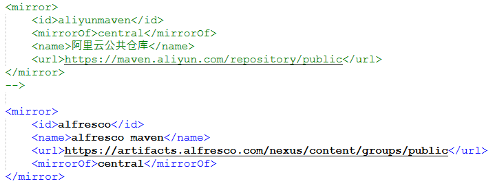 <mirror> <id>alfresco</id> <name>alfresco maven</name> <url>https://artifacts.alfresco.com/nexus/content/groups/public</url> <mirrorof>central</mirrorof> </mirror>