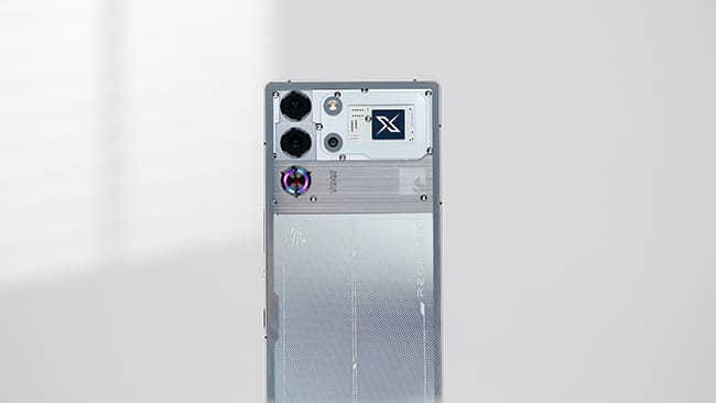 机身背部依旧是备受好评的纯平无凸起设计,再配合玻璃盖板材质,一体感绝佳,红魔依旧是米粉心中理想的mix。我这台氘锋透明银翼配色,看上去颇具未来感,相比上代红魔9s全透面积约增加了30%,中间最大部分有点状纹理装饰的是电池部分,同时镜头、风扇等不同区域也都采用了不同纹理加以区分。