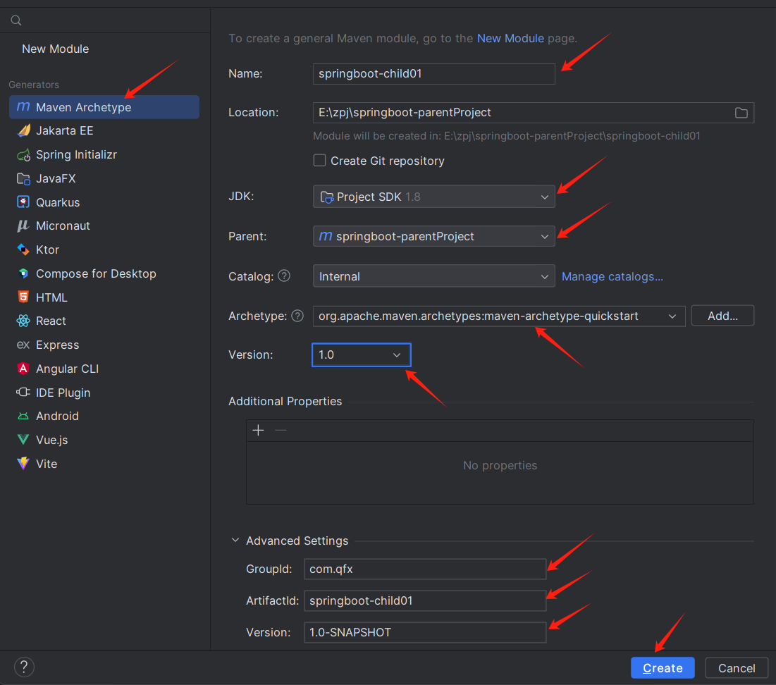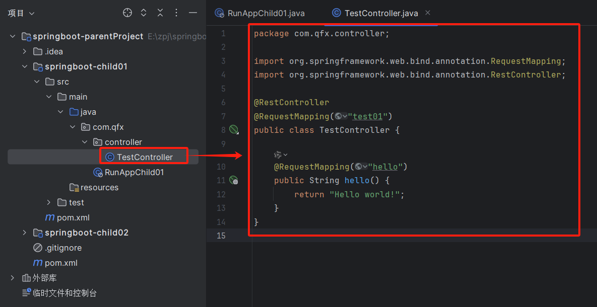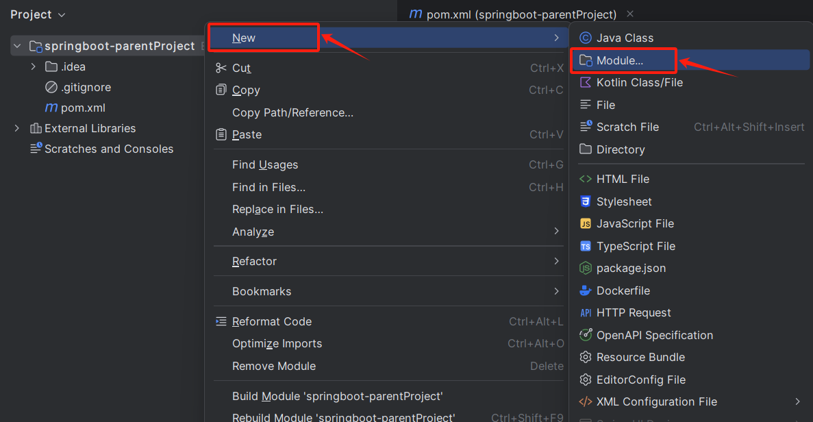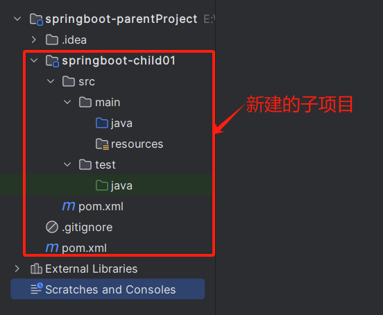 可以看到父项目的pom.xml文件中新增了一个<modules></modules>模块,里面已经引用了刚刚创建的子项目