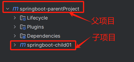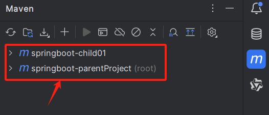 如果右侧的maven部分出现父项目和子项目同级的情况,如下图: