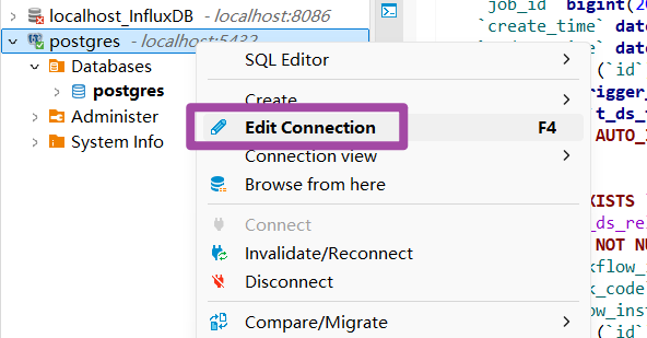 首先,在对应的postgresql数据库连接上右键,选择“edit connection”选项,如下图所示。