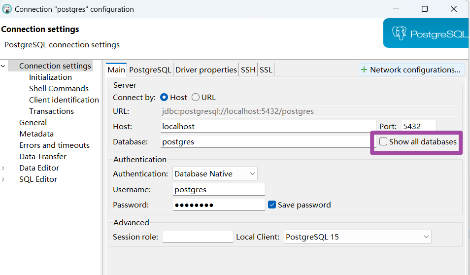 最近,在dbeaver中连接了本地的postgresql数据库。但是连接后打开这个数据库时发现,其所显示的databases不全。如下图所示,databases只显示了一个postgres,但实际上我本地postgresql的databases远远不止这一个。其中,这个postgres是postgresql的默认数据库——换句话说就是dbeaver目前只显示了postgresql的默认数据库,而没有显示我们手动创建的数据库。