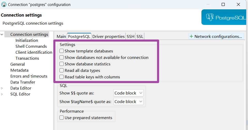 但是,对于部分dbeaver版本,在连接设置界面的上述“main”栏目中可能无法找到上图所示的勾选项。针对这种情况,大家就在这个界面的第二个栏目——也就是“postgresql”这个栏目下,查找一下其中的几个勾选项;如下图所示。