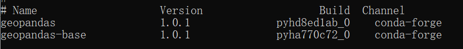 安装完毕后,使用conda list geopandas查看库是否安装成功。如能正确显示版本信息,即安装成功: