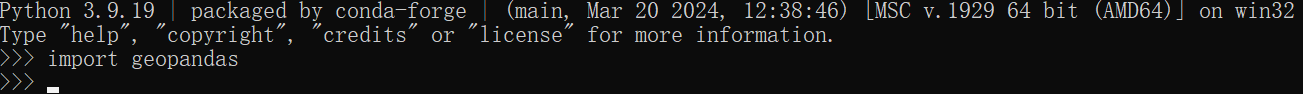 在anaconda下,使用python命令进入python解释器,使用import geopandas测试能否正确导入库。如果没有显示报错信息,则导入成功: