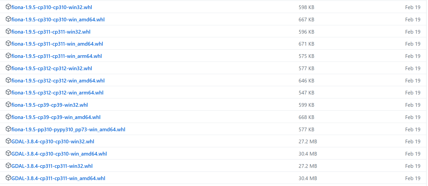 将gdal、fiona、pyproj、rtree、shapely五个库的whl文件从网上下载到本地,下载地址:https://github.com/cgohlke/geospatial-wheels。