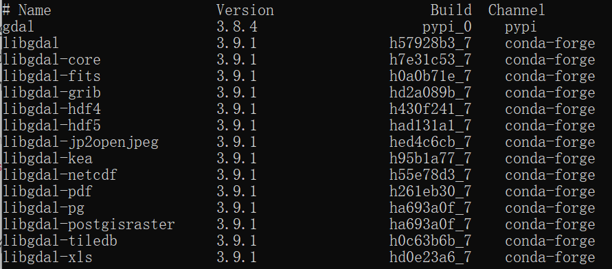 稍作等待后安装,可用conda list gdal来验证是否安装成功,出现如下信息后表示安装成功: