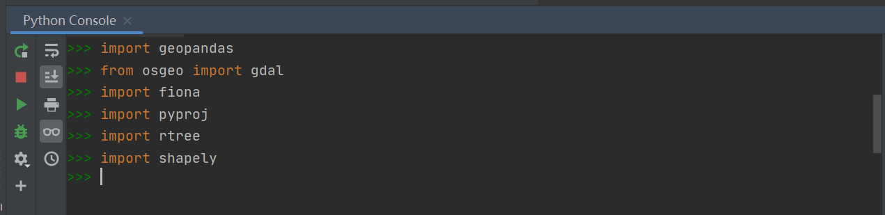 成功安装好geopandas后,可以在python中import测试是否可以成功导入geopandas、gdal、fiona、pyproj、rtree、shapely这几个库。例如我在pycharm的控制台中,使用import geopandas来测试geopandas能否正常导入,其他包同理。