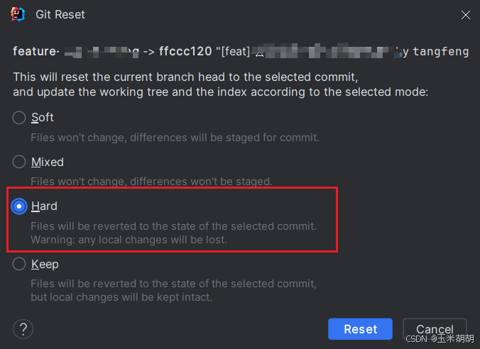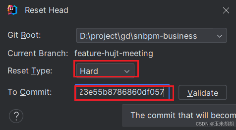 3. 弹出的窗口中,reset type选择【hard】,to commit选项的值为第一步骤中【copy revision number】的值,最后点击【reset】,如下图: