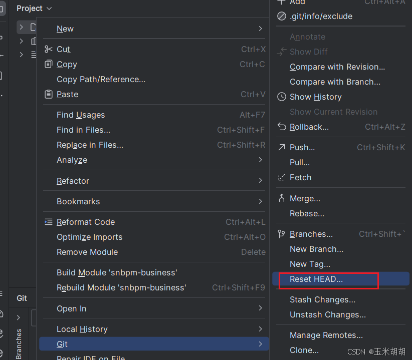 2. 选中项目,鼠标右键选择【git】——>【reset head…】,如下图所示: